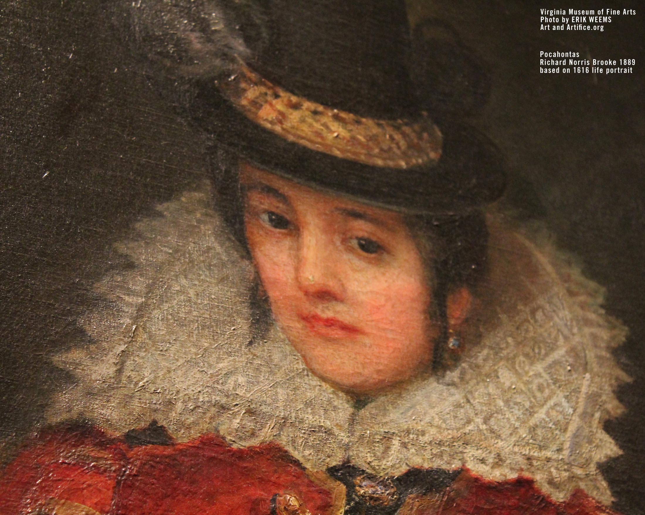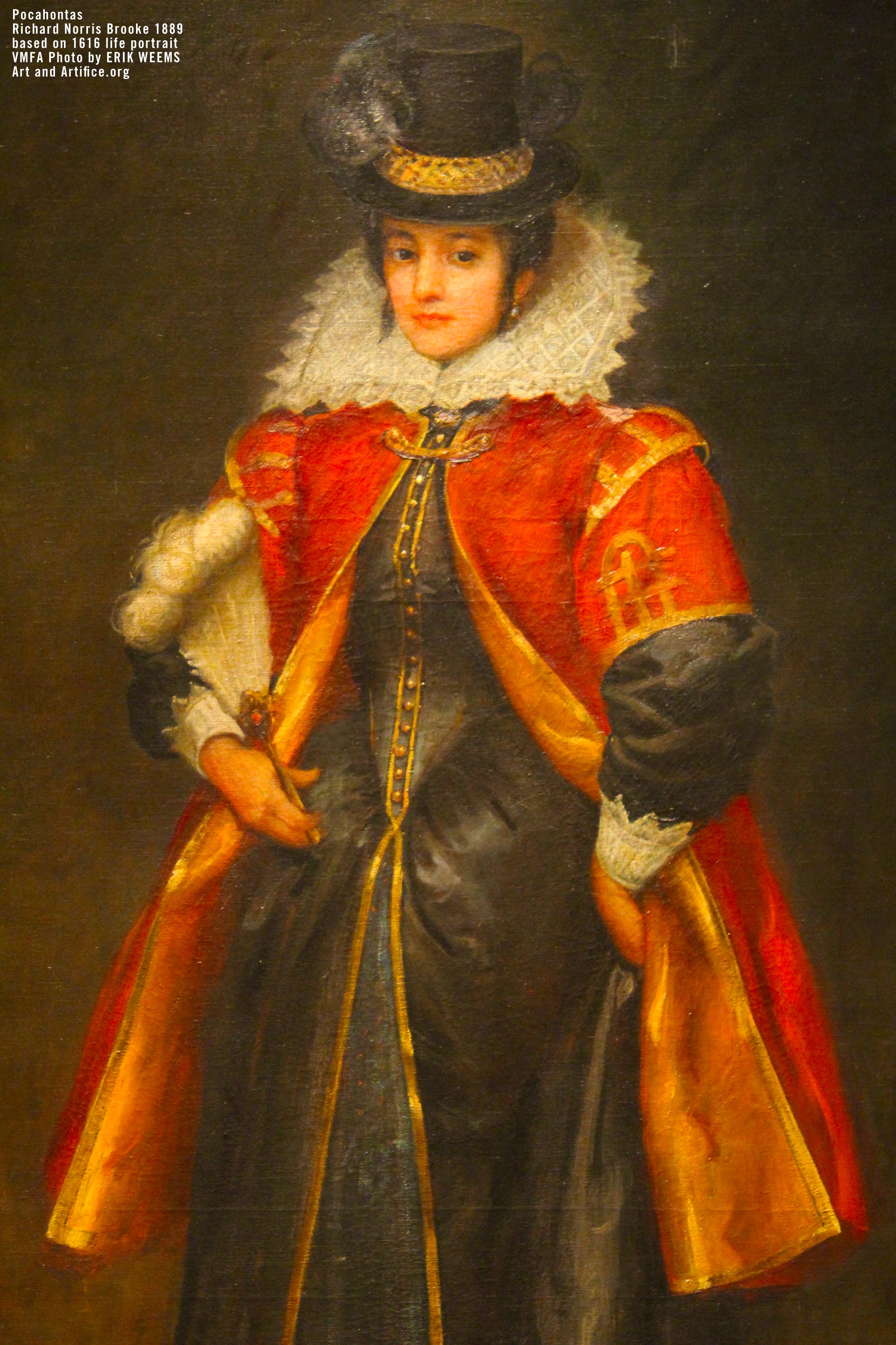 This "Portrait of Pocahontas" by Richard Norris Brooke (1847–1920) is a controversial image of the famous Native American from the Tidewater area of Virginia. Born in 1596, she was given the name Amonute (the meaning of which is unknown), and her private tribal name was Matoaka, which is thought to mean “playful one between two streams” or “bright stream between two hills.” Her well-known nickname, Pocahontas, literally means “playful one.”